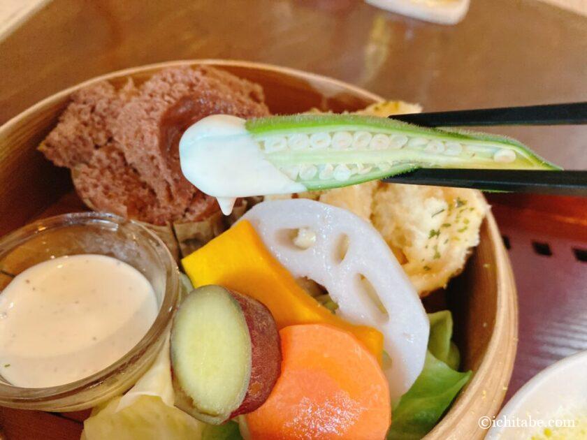 画像ではわかりづらいですが、実際は割と大きいので、「すんごい野菜食べてるわ!」って思うぐらいモリモリ野菜を食べれます。野菜好きの筆者は嬉々としながら食べていました…♪