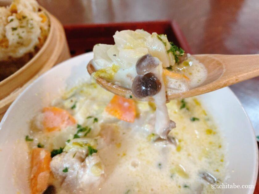 スープはレモン風味のシチューで、白菜、人参、たまねぎ、パセリ、ジャガイモ、しめじ、鶏肉と具だくさんです。レモン風は初めて食べましたが、相性が良いもんですねー。自分で作る時に試そうかなと思います。