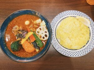 米は白ライスかターメリックの2種から選ぶことが出来て、こちらもあいがけが可能です。盛り付けの関係で1種の方が総量は多くなると説明がありました。