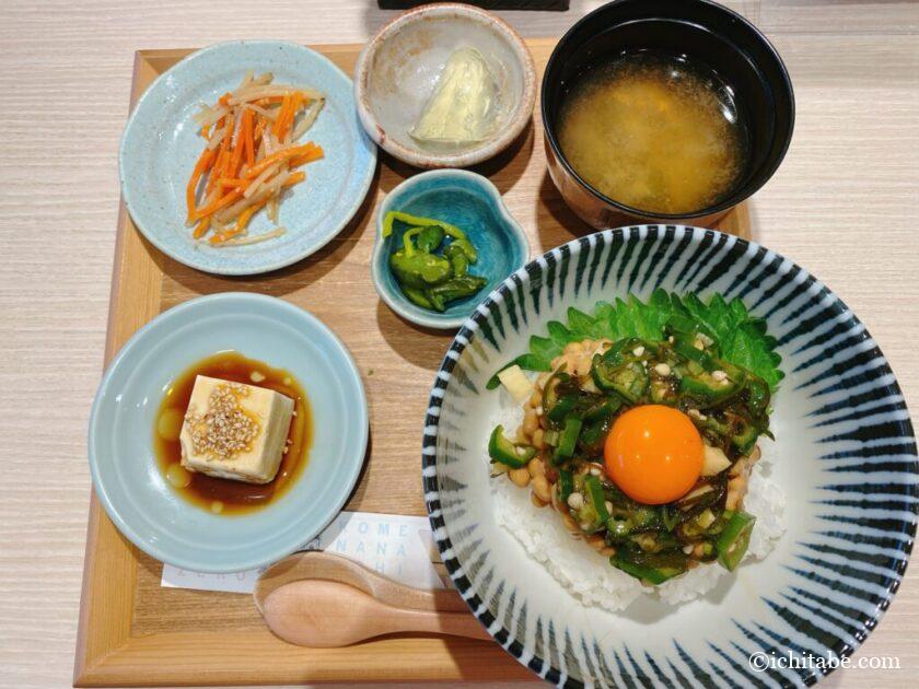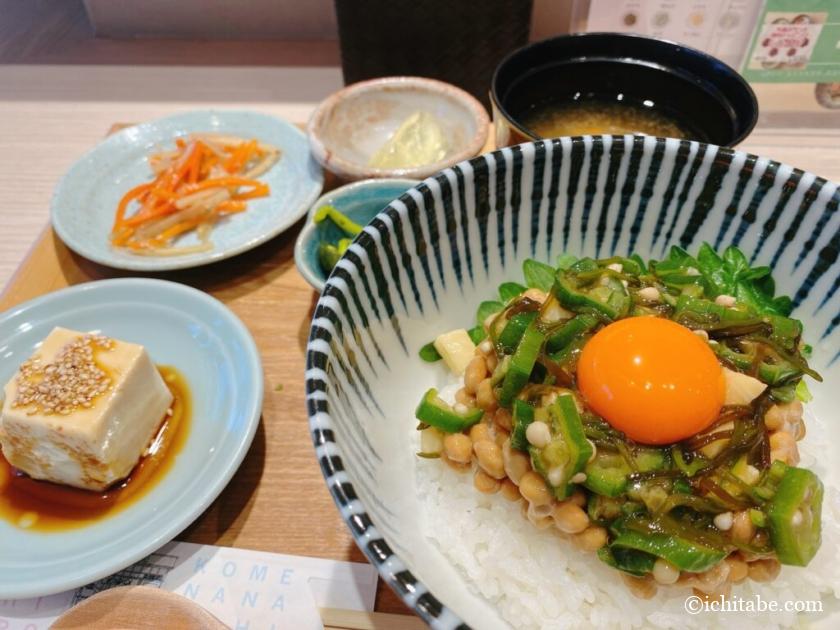 今回は頼んだのはこちら「新ねばねば」です。いやー、美味そうですねー。メインの納豆ご飯は角切り山芋、めかぶ、おくら、塩昆布、ごまが入っていて、黄身の色が濃い島根の出雲卵黄が入ってます。腸活におすすめ!らしいですよw