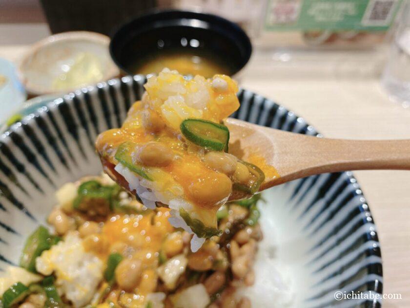 「納豆のコクがすごい…専門店を名乗るだけあるなー」。納豆の旨味が前面に出てきます。 また、 「苦手な人でも食べれるように」というコンセプトを掲げるだけあって、癖やにおいがよく抑えられてます。 タレは甘みがあり風味も良くて、これまたコクのある卵との組み合わせがピカイチ。もうこれだけで納豆が美味いです。おくらや山芋などのシャキシャキ感に、シソの苦みが良いアクセントを出してました。全体が良いバランスで絡む絡む…♪